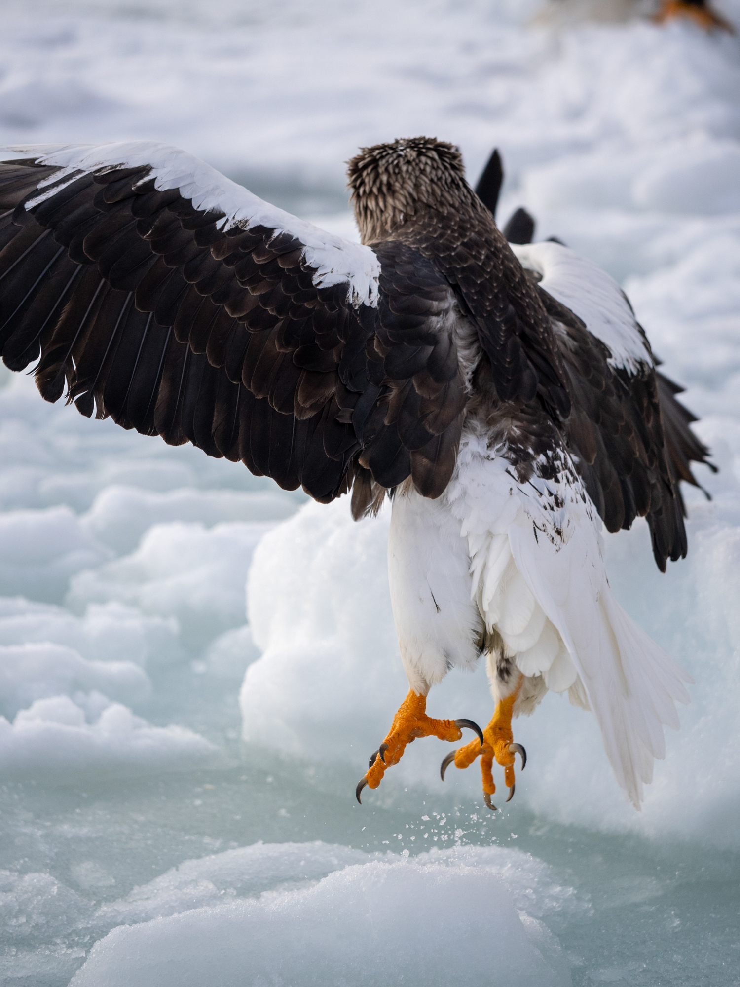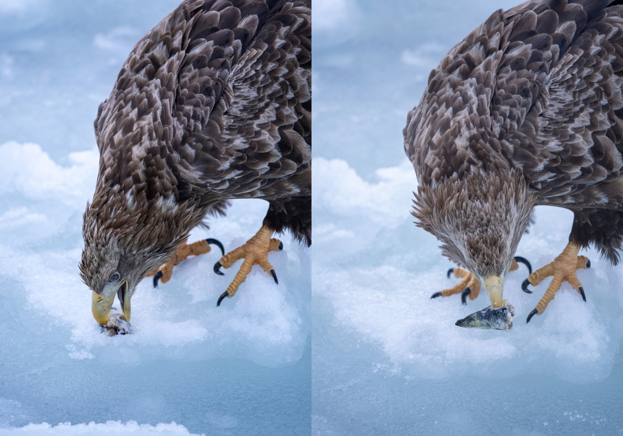 Volviendo a las fotos, detenerme para hacer una pausa y observar la alimentación me dio la oportunidad de observar a las aves en lugar de disparar continuamente, y su tamaño, forma y colores son impresionantes, especialmente de cerca. Como una de las aves rapaces más grandes del mundo, sus patas me parecieron fascinantes, fuertes, blancas y sólidas, sobre todo porque sus vibrantes garras amarillas aprietan el pescado y el hielo.