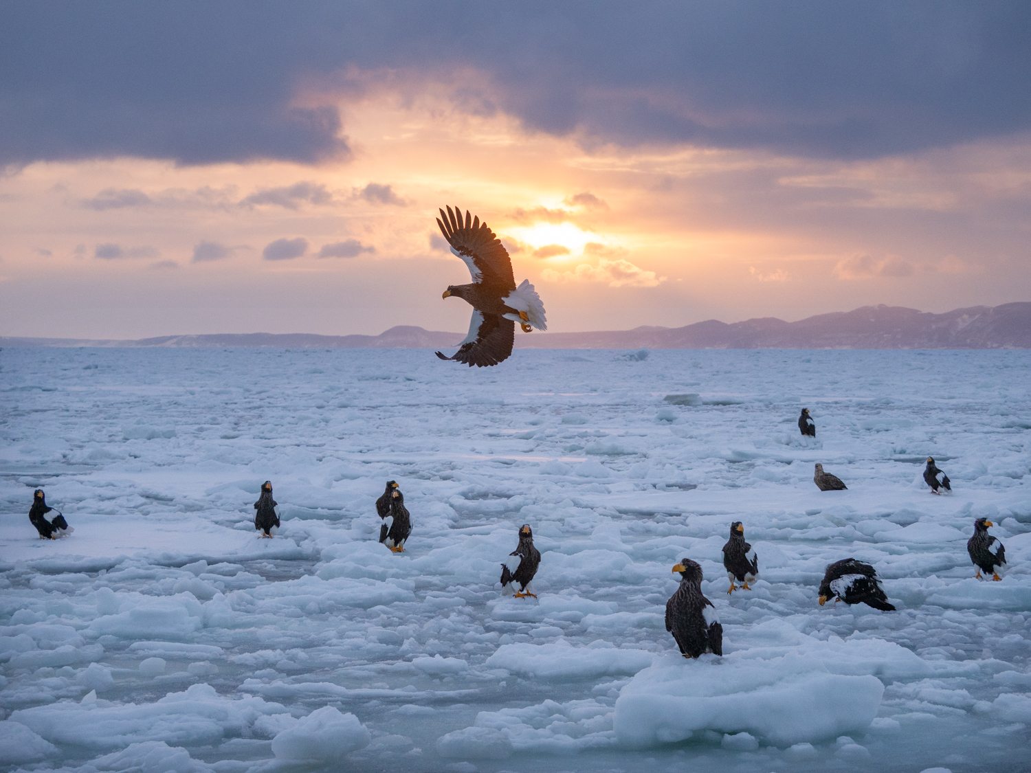 Si bien puedes tener suerte y ver las águilas entre el hielo a la deriva a lo largo de la costa norte de Hokkaido en invierno, Rausu ofrece la oportunidad de verlas de cerca, con capitanes capacitados que saben dónde encontrarlas para asegurarse de que estás capturando imágenes mientras el cálido resplandor del amanecer ilumina la escena.