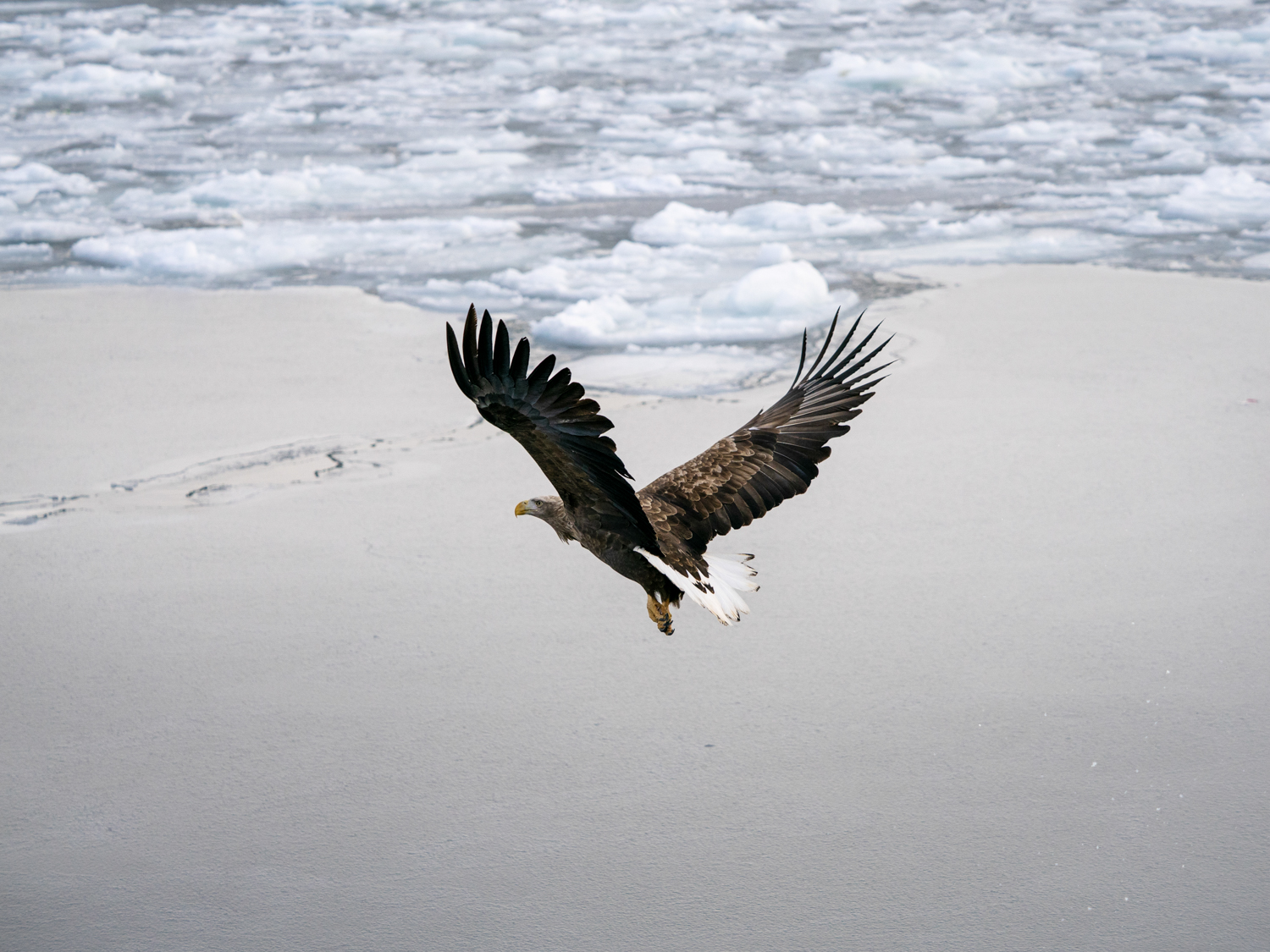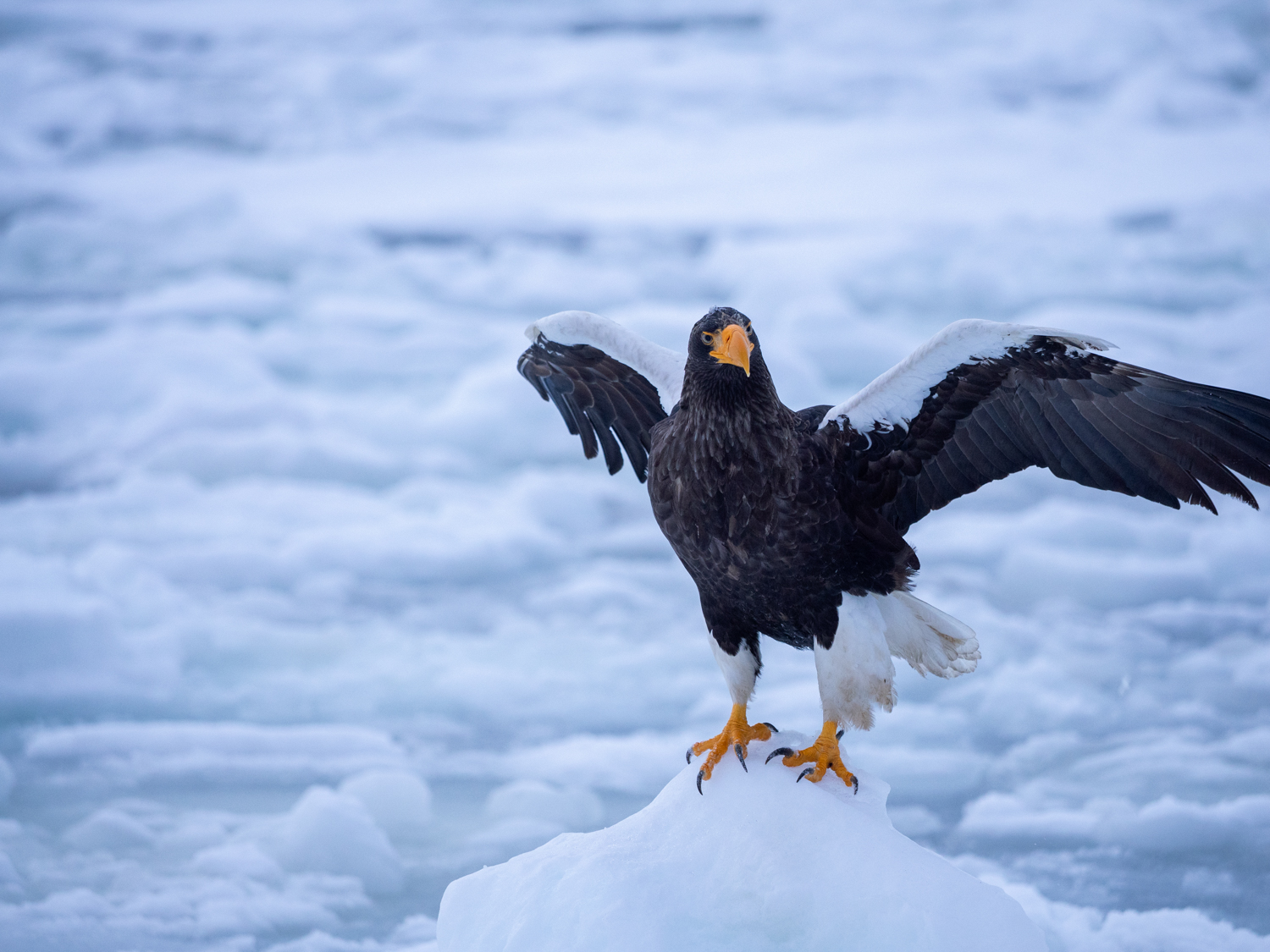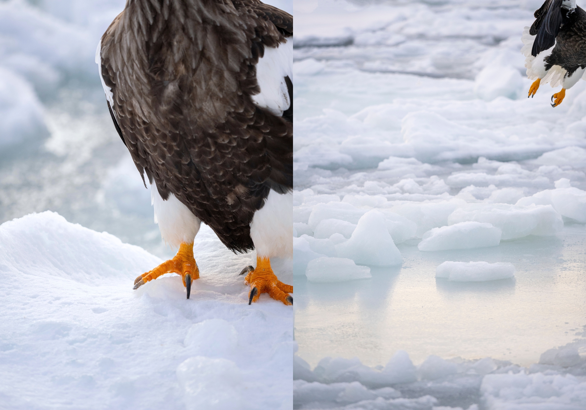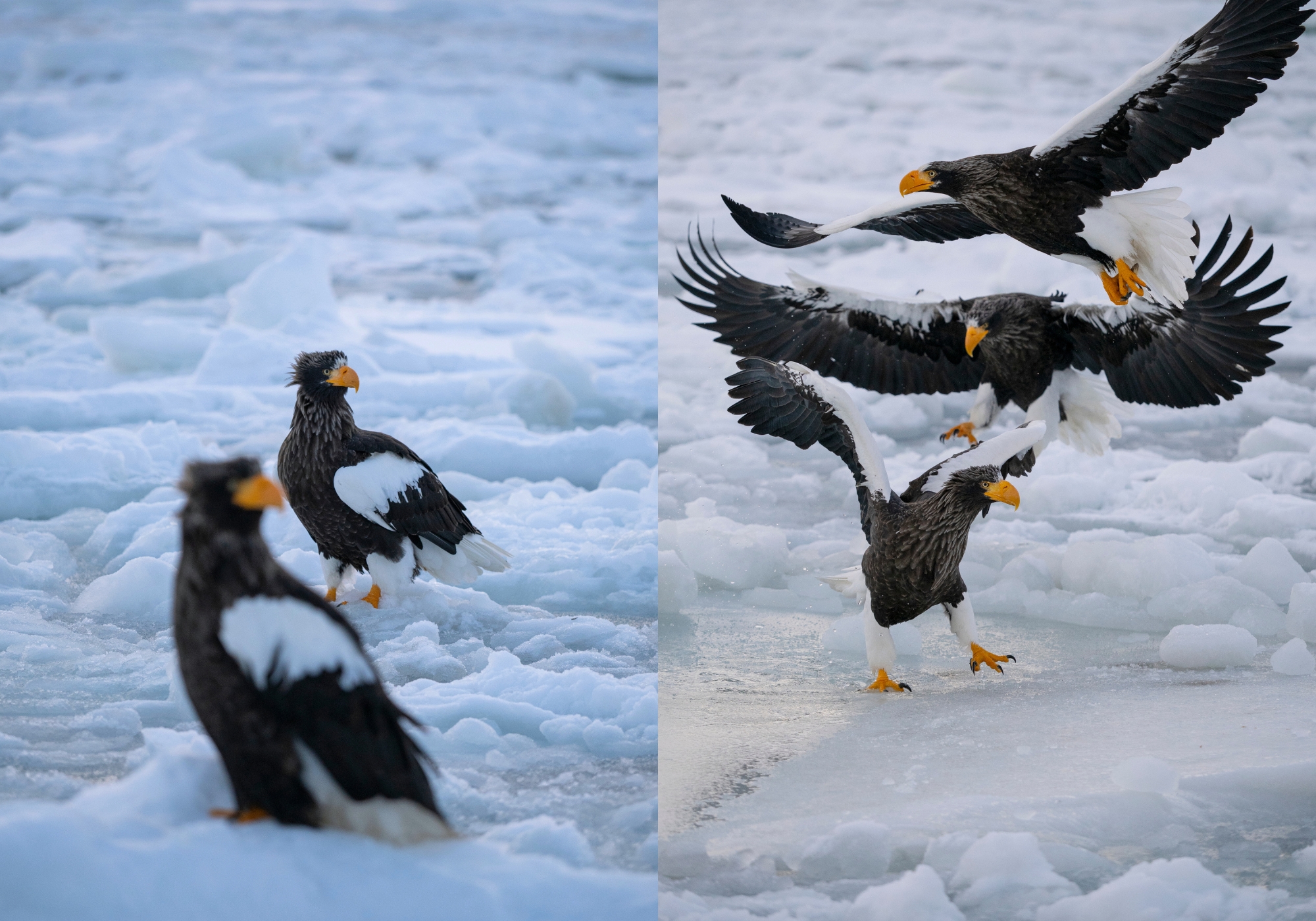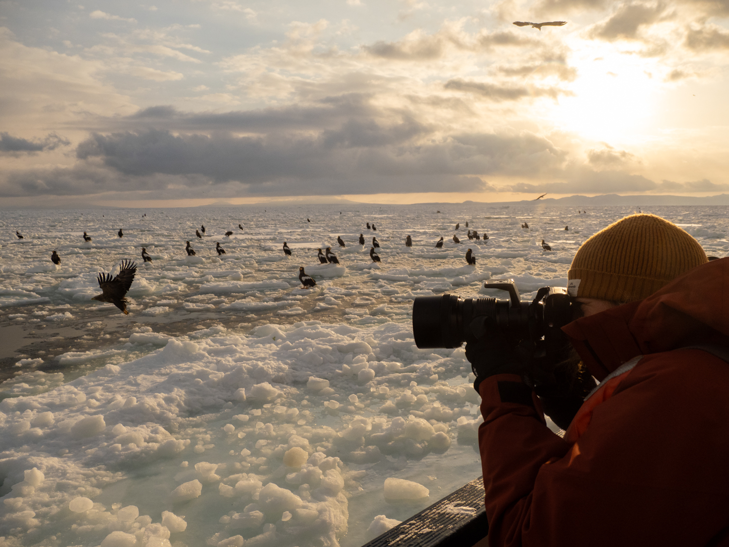 A medida que nos acercábamos a la isla Kunashiri, apareció una línea blanca a través del mar. El hielo a la deriva pronto estuvo a nuestro alrededor y redujimos la velocidad para buscar las águilas. Inmediatamente pensamos en el frío, encontramos el hielo a la deriva y, en cuestión de segundos, las águilas marinas de Steller eran visibles. Sentados tranquilamente sobre los icebergs y con mucha curiosidad por nuestra llegada.