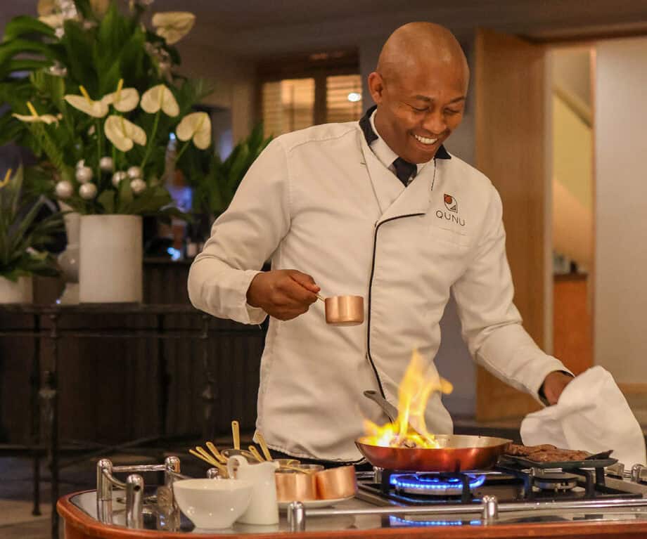 Quizás el más impresionante de estos espacios sea el restaurante Qunu, que lleva el nombre del lugar de nacimiento y retiro de Mandela. El espacio de varios volúmenes tiene una sensación de catedral, con excepcionales obras de arte adornando las paredes, mesas colocadas selectivamente en todas partes y un espacio dedicado para el brillante piano de cola, que toca a diario el talentoso Jonathan. No puede faltar en el menú el Steak Diane, con su impresionante cocina en la mesa y su espectacular teatralidad con llamas.