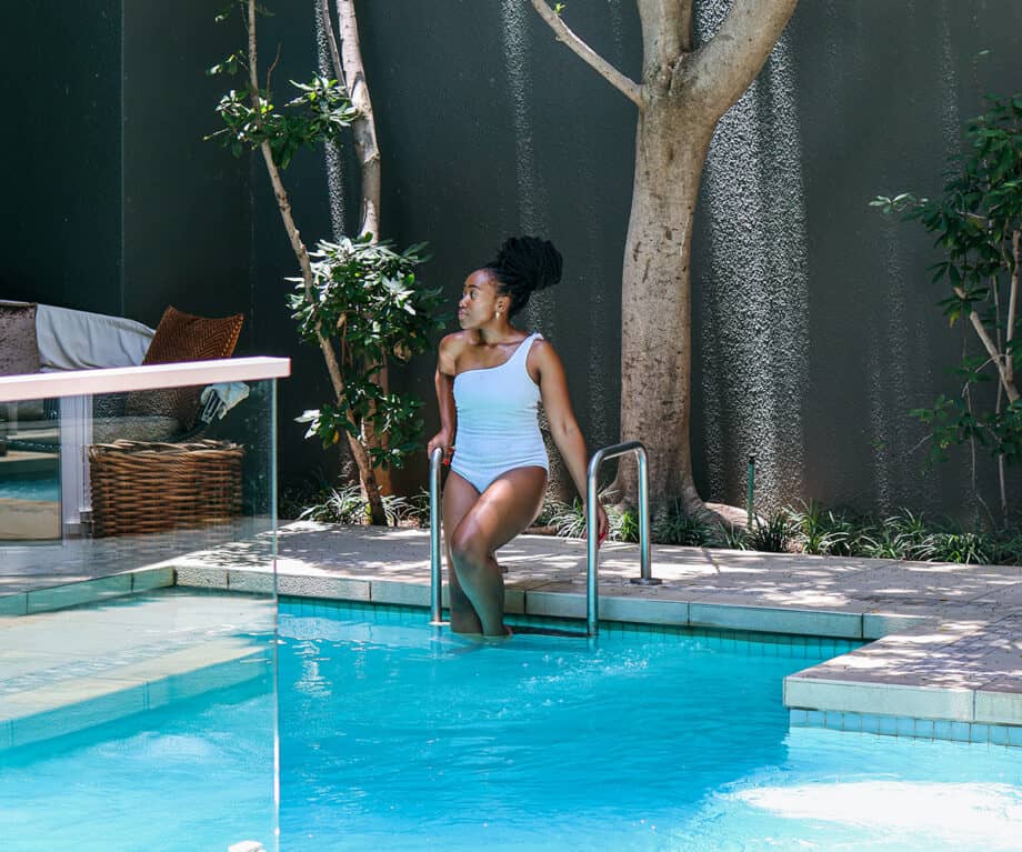 Cuando llega el momento de aventurarse fuera del santuario de la habitación, los pasillos conducen a una variedad de áreas comunes. En el patio inside, una piscina climatizada, un estanque Koi, un gimnasio y cabañas brindan un agradable espacio para el tiempo de descanso. A lo largo del edificio, el Olive Bar, el Piano Lounge y la Terrace ofrecen espacios informales y refinados para conectarse con uno de los platos clásicos sajones o una copa del famoso vino sudafricano. Desde todos ellos se accede a la gran piscina exterior climatizada, que sirve de fachada azul al resort.