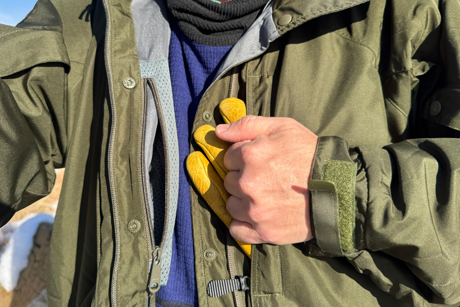 Una vez que conoces los bolsillos, su practicidad es evidente. Si bien puedes guardar cualquier cosa en cualquier lugar, los bolsillos con cremallera en el pecho son largos y están pensados ​​para artículos más ligeros como mapas u hojas de identificación rápida. También puedes guardar guantes allí, pero descubrí que cualquier cosa pesada se deslizará sobre tu pecho y te resultará incómodo.