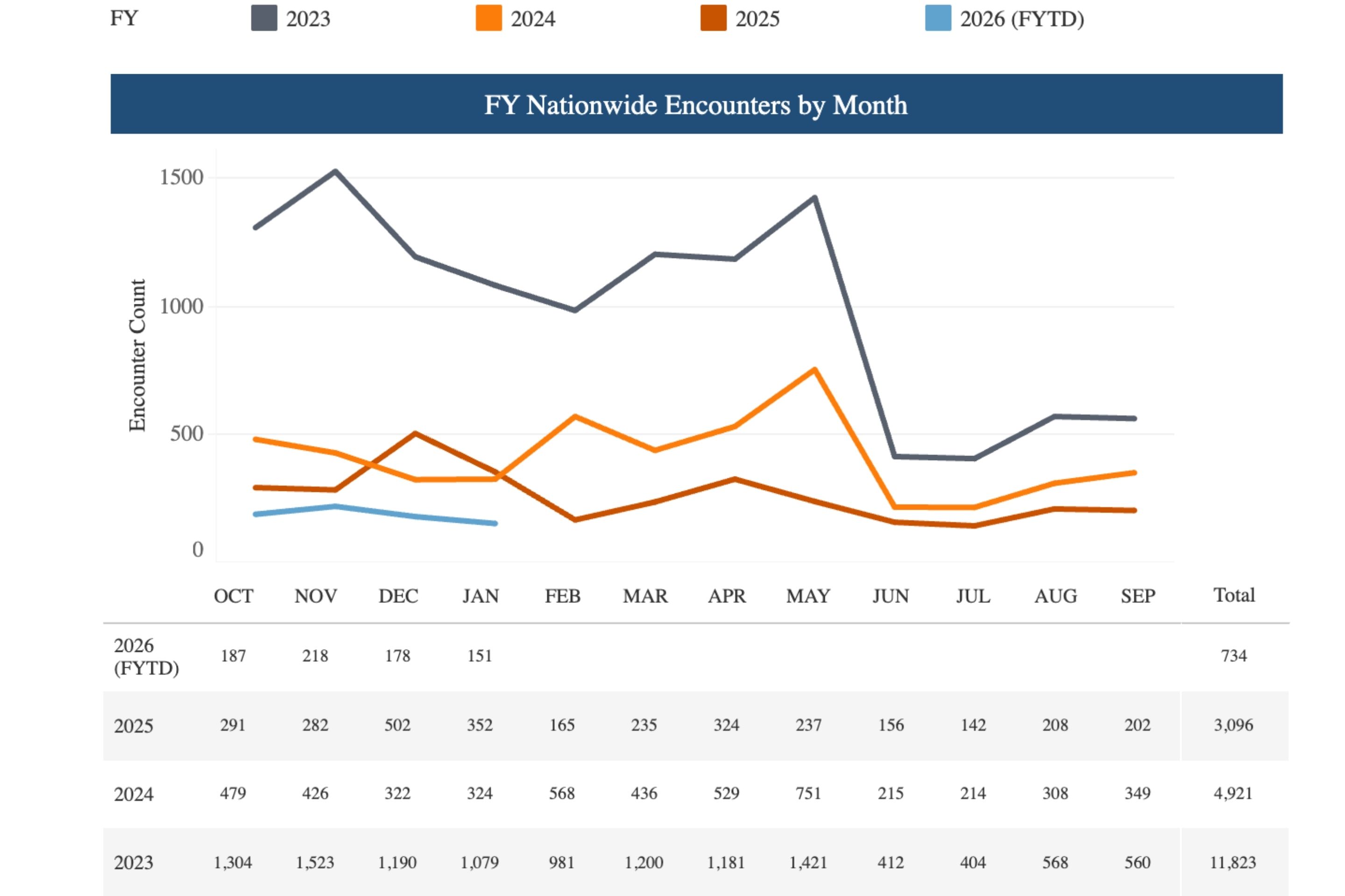 De acuerdo a Datos propios de CBPla Patrulla Fronteriza tuvo 3,096 encuentros con personas en el sector Massive Bend en 2025 y 4,921 en 2024, una marcada disminución de los 11,823 encuentros en 2023.